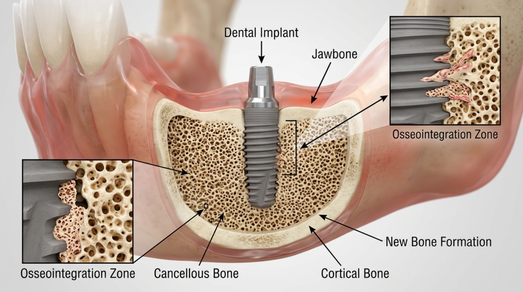 خلايا العظم تنمو تدريجياً حول سطح الزرعة وتلتصق به. التيتانيوم الذي تصنع منه الزرعة له خاصية فريدة تجعل العظم يتقبّله كأنه جزء من الجسم. هذا الاندماج يجعل الزرعة ثابتةً كالسن الأصلي، لكنه يحتاج وقتاً وهدوءاً وتغذيةً جيدة.