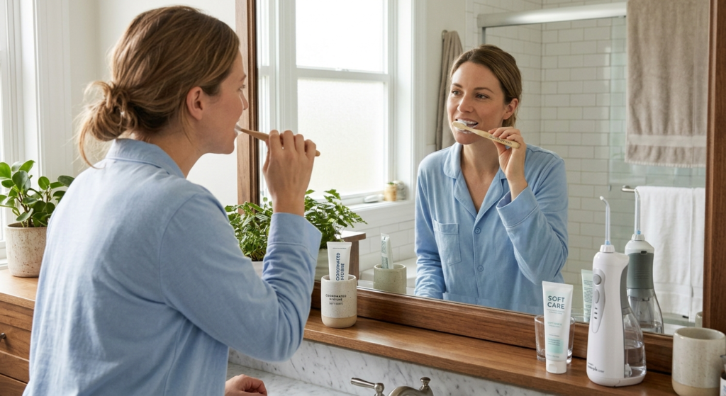 المساء: تنظيف شامل مع الخيط الجراحي أو الدش الفموي، ثم فرشاة، ثم غسول فم. النوم بفم نظيف تماماً هو أهم نقطة في هذا الروتين لأن بكتيريا الفم تنشط ليلاً.